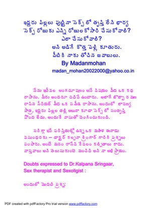 ¬É÷ð ¨Í œÁÇ¡Ãà ¨Êþà ¤Â§Áê ¬É÷ð §ÍüÅÁÅ ‡þÃä §ÍüŨͳ§à úʬÁÅͩ¨Ã? ‡¨Â úʬÁÅͩ¨Ã? €þà €™ÃÊ ÌœÁà ¡É®Ãì ÁÆœÁŧÁÅ. ©ÄýÃà þÂÁÅ œÍúÃþÁ ü©Â£Å¨Å. By Madanmohan madan_mohan20022000@yahoo.co.in þÊþÁÅ ‚ýÄ©Á¨ €ÏÁúÁÆ«Á›Ï €þÊ ©Ã«Á¦ÁÏ ¥ÄžÁ ŠÁ ÁŸÁ §Â³ÂþÁÅ. ¥Ä§ÁÅ €ÏžÁ§ÁÆ úÁžÃ©Ê „Ïý§ÁÅ. €¨ÂÊ £Ì£Âç §Á¥Á› §Â¬ÃþÁ ¬Ä§Ã¦Á¨÷ ¥ÄžÁ ŠÁ ¬Á¥Ä¯Á §Â³ÂþÁÅ. €ÏžÁÅ¨Í ¨Â©Á›ê ±ÂœÁë, ‚žÁâ§ÁÅ ¡Ã¨ì¨ œÁ¨Ãì €¦þ Áƙ ¬É÷ð ¨Í ¬ÁÏœÁÇ¡Ãà ±ÌÏžÁ ¨ÊžÁÅ. €ÏžÁÅÊ ©Â¬ÁÅœÍ žÉÏÃÏúÁÅÁÅÏžÃ. ¬Á§ÃÂÓ ‚žÊ ¡Á§Ã¬ÃàœÁŨÍì „þÁä ŠÁ ¥ÁÿîÁ ƒþ™ÁÅ ©Á¬ÁÅÏŸÁ§ÁÁÅ -- ™ÂÁÛ§÷ Á¨åþ ªÃëϧ÷ §Ãà ¡ÁëªÁä¨Å ¡Áϱ§ÁÅ. €ÏýÊ ¥ÁþÁÏ §Â¬Ê©Ã Ê©Á¨Ï Á¨ÃåœÂ¨Å žÁÅ. ©Â¬Áà©Â¨Å €þà œÉ¨Å¬ÁÅÁÅÏýÉ ¥ÁÏúÞà €þà þ €¤Ã±Âë¦ÁÏ. Doubts expressed to Dr.Kalpana Sringaar, Sex therapist and Sexoligist : €ÏžÁÅ¨Í ¥ÉÅžÁýà ¡ÁëªÁä: PDF created with pdfFactory Pro trial version www.pdffactory.com