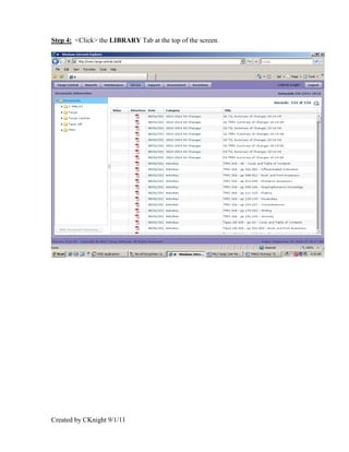 The document provides steps to access the user manual for the Tango PALM software. It instructs users to open an internet browser, go to the Tango website, log in, click the library tab, and navigate through folders to find and open the PALM user guide in PDF format. They can then print sections of interest.