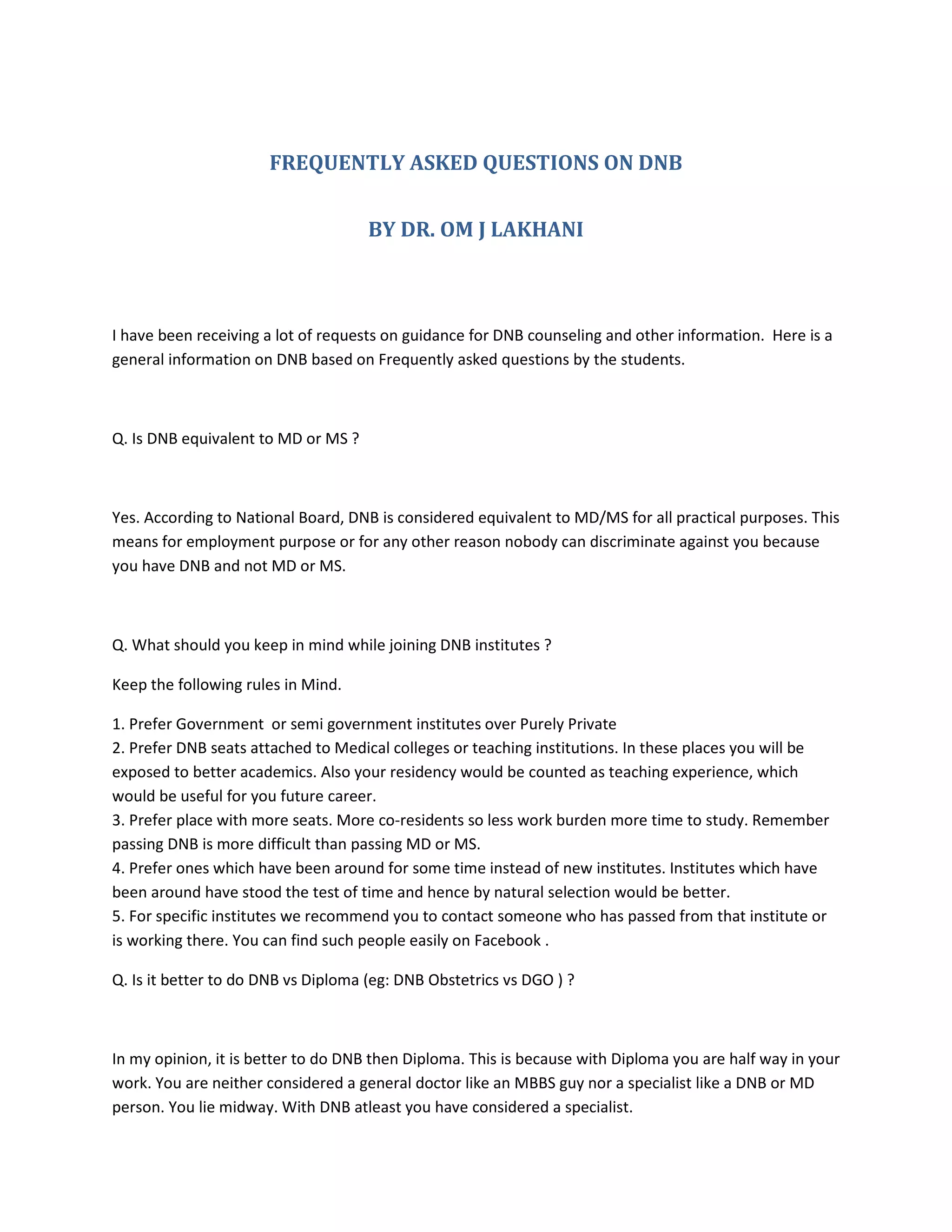 This document provides information on frequently asked questions about the DNB program. It discusses topics such as the equivalence of DNB to MD/MS degrees, factors to consider when choosing a DNB institute like preferring government institutes, and whether it is better to pursue a DNB or diploma. The document also lists recommendations for good institutes in specific DNB subjects based on internet forums, with the caveat that the information is not authenticated.
