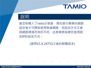 說明 當您新購入了netis分享器,需先進行簡單的網路 設定後才可開始使用無線網路,但設定方式又會 因網路環境而有所不同,此教學將指導您使用固 定IP的設定方式。 (適用V1.X.24753之後的韌體版本)