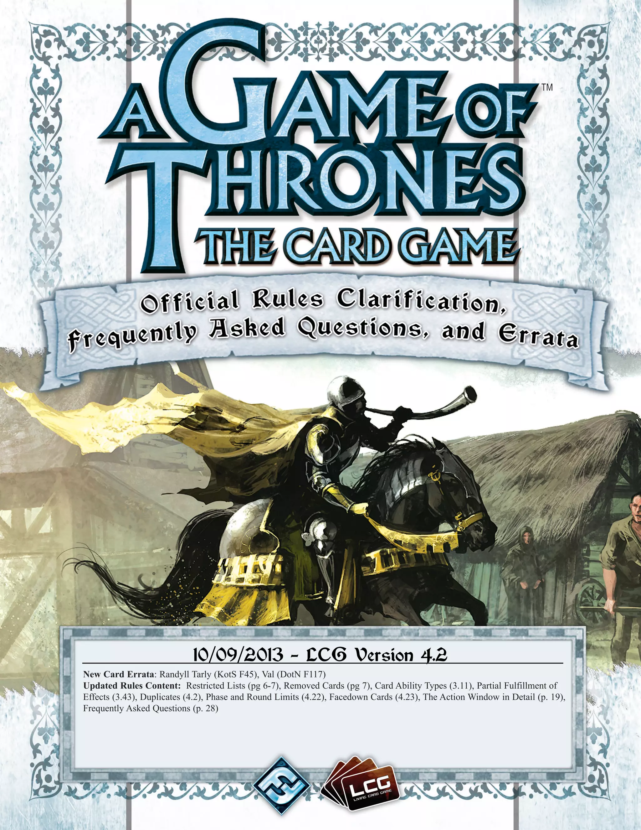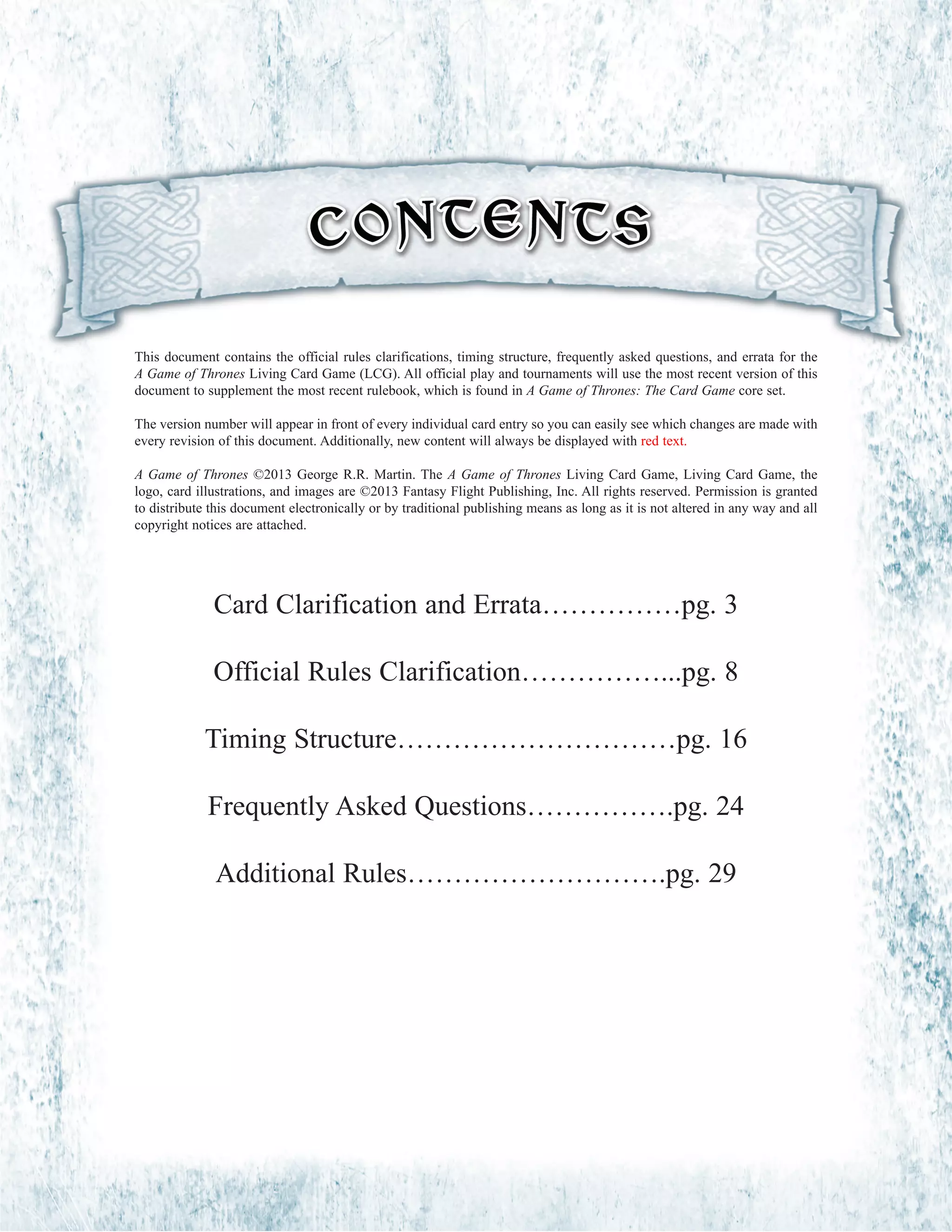 This document provides errata and clarifications for cards in the A Game of Thrones LCG. It summarizes errata for over 100 individual cards across multiple card sets. It also provides the most up to date rules clarifications and answers to frequently asked questions. The document is the official source for how the game and specific cards are intended to be played in tournaments.