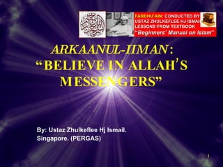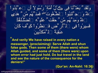 1. The document discusses the concept of prophethood in Islam, explaining that Allah sent prophets and messengers to every nation to guide mankind and call them to worship Allah alone.