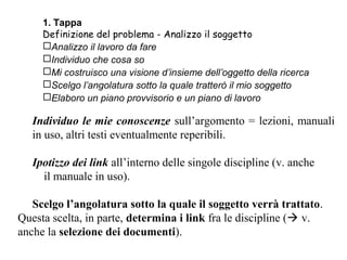 Il documento descrive le sei tappe di un progetto di ricerca, che includono la definizione del problema, la ricerca di fonti, la selezione dei documenti, la raccolta e l'elaborazione delle informazioni, fino alla comunicazione e valutazione del lavoro. Ogni fase fornisce indicazioni pratiche su come procedere e quali strumenti utilizzare, evidenziando l'importanza di una buona selezione e citazione delle fonti. Inoltre, si discute il valore del riferimento bibliografico per conferire autorevolezza al lavoro di ricerca.