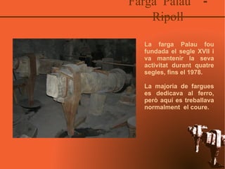 Farga Palau - Ripoll La farga Palau fou fundada el segle XVII i va mantenir la seva activitat durant quatre segles, fins el 1978. La majoria de fargues es dedicava al ferro, però aquí es treballava normalment el coure.
