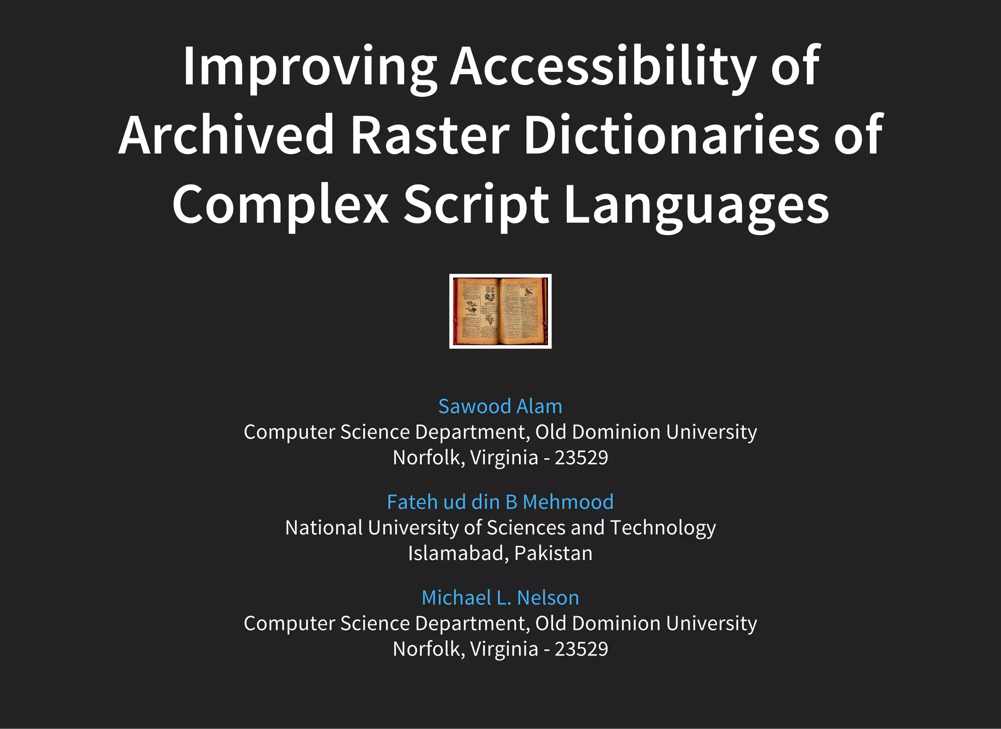 The document discusses the challenges of improving accessibility to archived raster dictionaries for complex script languages, focusing on Urdu and Arabic. It outlines issues related to collation, indexing, and user contribution in creating a multi-lingual dictionary explorer. Future efforts aim to address existing problems and enhance the indexing process.