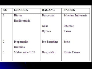 Dokumen ini menjelaskan berbagai kelas obat untuk saluran cerna, termasuk obat tukak-peptik, antiemetik, pencahar, dan antidiare, serta mekanisme kerja dan efek sampingnya. Obat-obat tersebut meliputi antasid, penghambat pompa proton, dan agen pelindung mukosa, serta antispasmodik dan kolagog untuk kondisi terkait pencernaan. Rincian mengenai indikasi, kontraindikasi, dan cara penggunaan juga disajikan untuk membantu pemahaman tentang penggunaan obat-obatan ini.