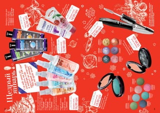 Документ представляет собой каталог продуктов с акциями на косметику и средства для дома на январь 2015 года. Включает различные товары, такие как косметические средства, духи и бытовую химию, с указанием их кодов и цен. Потребителям предлагаются специальные условия и скидки при заказе товаров из определенного перечня.