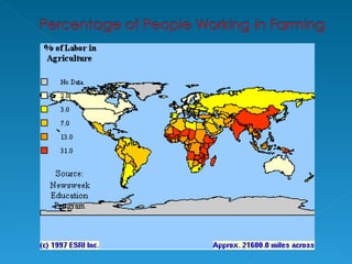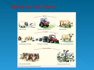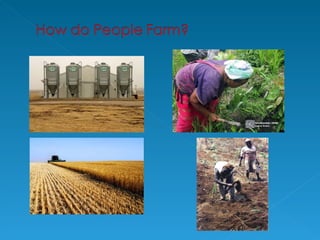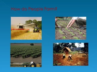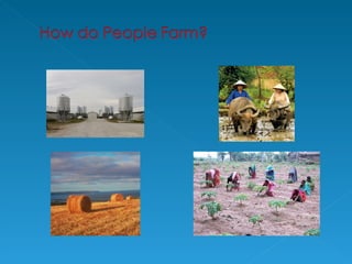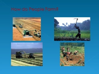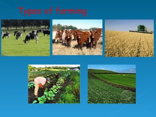 Farming is an example of a primary economic activity because it involves taking various inputs like climate, soil, money, labor and machines, and processing them through activities like plowing, planting, harvesting, and milking to produce outputs like crops, livestock, and other agricultural products. There are different types of farming including arable, which focuses on crop growing; pastoral, which specializes in animal rearing; and mixed, which combines both crop and animal farming. Farming can also be subsistence, where most produce is consumed on the farm, or commercial, where the majority is sold for profit.