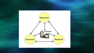 The document discusses farming systems research and extension (FSR/E). It defines FSR/E as an approach that views the entire farm as a system and considers interactions within it. Key features include taking a holistic, interdisciplinary, farmer participatory approach to problem solving. The goal is to develop sustainable farm household systems. Some challenges to implementing FSR/E include institutional conflicts, defining homogenous client groups, lack of flexible resources and qualified staff, and higher costs.