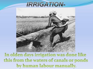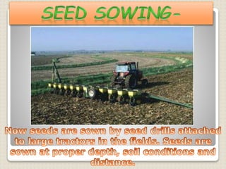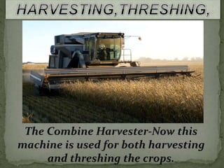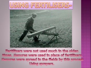 The document discusses the differences between modern and old farming methods. In olden times, farming relied more on manual labor and green manures rather than machines and chemical fertilizers. Seeds were also of lower quality. Now, agriculture utilizes many machines, produces higher yields through improved techniques, and relies more on chemical pesticides, fertilizers, and higher-quality seeds. However, modern farming also causes more pollution and environmental degradation through extensive machine and chemical use.