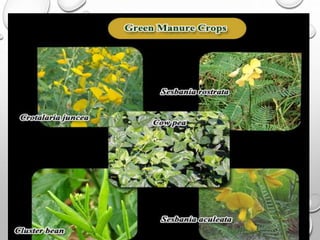 The document provides an extensive overview of different types of organic manures, including animal manure, compost, green manure, and vermicompost, highlighting their importance in restoring soil health and fertility. It details the composition, preparation methods, and benefits of each type, emphasizing the role of nutrients and the processes of decomposition involved. Additionally, it addresses techniques for creating compost and vermicompost, along with the specific requirements for successful implementation.