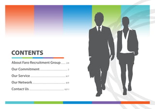 Faro Recruitment Group is an international staffing firm established in 1981 with over 80 offices worldwide. It provides permanent recruitment, temporary staffing, executive search, project recruitment, HR consulting, and advertising services through various subsidiary brands. The document provides an overview of Faro's history, services, network coverage, and contact details for its offices globally.
