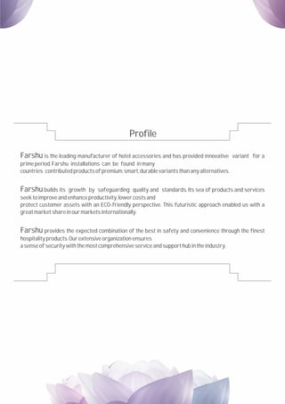 Farshu is a leading manufacturer of hotel accessories that provides innovative products with premium quality and durability. It has a wide range of hospitality products that offer safety, convenience, and efficiency. Farshu prioritizes quality standards and sustainability to provide comprehensive service and support to customers internationally.