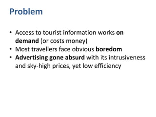 The document proposes a mobile application called farSight that would provide daily challenge quests and storylines to make travel more interesting. It would generate income through partnership subscriptions and in-app purchases. The app would use augmented reality to enhance quests and partner businesses. It aims to be the first all-in-one app that connects useful travel features in an entertaining and social way, addressing a $710 billion market.
