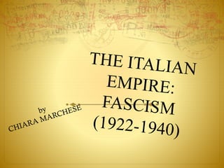 Benito Mussolini ruled Italy from 1922 to 1940 as Il Duce. He was inspired by the Roman Empire and consolidated power by controlling the media like newspapers, radio, and television. Mussolini modernized Italy through infrastructure projects but also instituted fascist laws that abolished civil liberties and democratic processes. He allied with Hitler in the 1930s and enacted racial laws against Jews. Mussolini's fascist regime was overthrown in 1943 when the Grand Council of Fascism voted to remove power from him and restore it to the king.