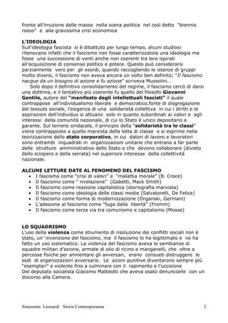 Il documento analizza le origini, l'evoluzione e le caratteristiche ideologiche del fascismo in Italia, iniziando dalla sua nascita nel 1919 a Milano e discutendo l'influenza di vari gruppi intellettuali e movimenti sociali. Viene evidenziato il ruolo di Benito Mussolini, la legittimazione della violenza attraverso le squadre fasciste, e l'importanza della manipolazione della scuola e della cultura per creare 'l'uomo nuovo' fascista. Infine, si esplora il ruolo tradizionale della donna nel regime, enfatizzando la sua funzione come madre e educatrice subordinata.
