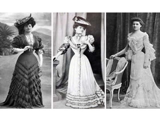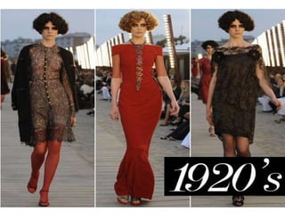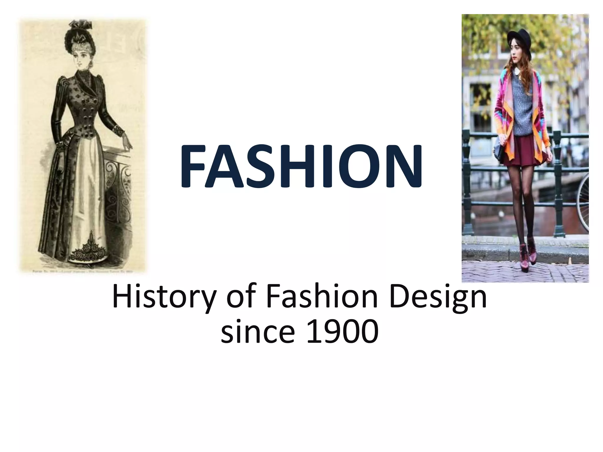 The document provides a history of fashion design since 1900. In the 1900s, the first fashion designer was Charles Frederick Worth, who designed dresses for Elizabeth of Austria. In the 1910s, after the Ballets Russes performed Scheherazade in Paris, Paul Poiret's fashion designs translated this Orientalism trend into harem and geisha inspired outfits featuring flowing fabrics and vivid colors. Poiret also created one of the first outfits women could put on without assistance. In the 1930s, as the effects of the Great Depression took hold, fashion became more modest and compromising with somber colors, longer hemlines, and feminine silhouettes reflecting the difficult social and economic times.