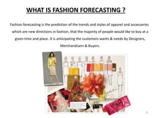 Fashion forecasting involves predicting trends and styles that customers will want to purchase seasons in advance. It is necessary because the fashion industry works well ahead of seasons to manufacture products on time. Forecasting includes studying market conditions, lifestyles, past data, street fashion, and designer collections. Understanding target customers through research like surveys and focus groups is also important for forecasting. Developing a calendar with key event dates helps coordinate manufacturing and delivery to have the right products at the right time.