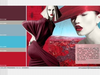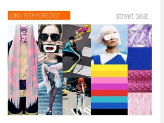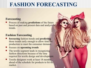 Fashion forecasting involves predicting upcoming trends in the fashion industry early enough to allow for production and distribution. It is a complex process that requires monitoring current trends, cultural influences, and consumer preferences to identify shifting attitudes and emerging styles. Key players in forecasting include designers, merchandisers, and specialized forecasting firms who analyze data from a variety of sources globally to determine colors, silhouettes, and fabrics that will be in demand for future seasons. Accurate forecasting is important for businesses to efficiently meet consumer demand.