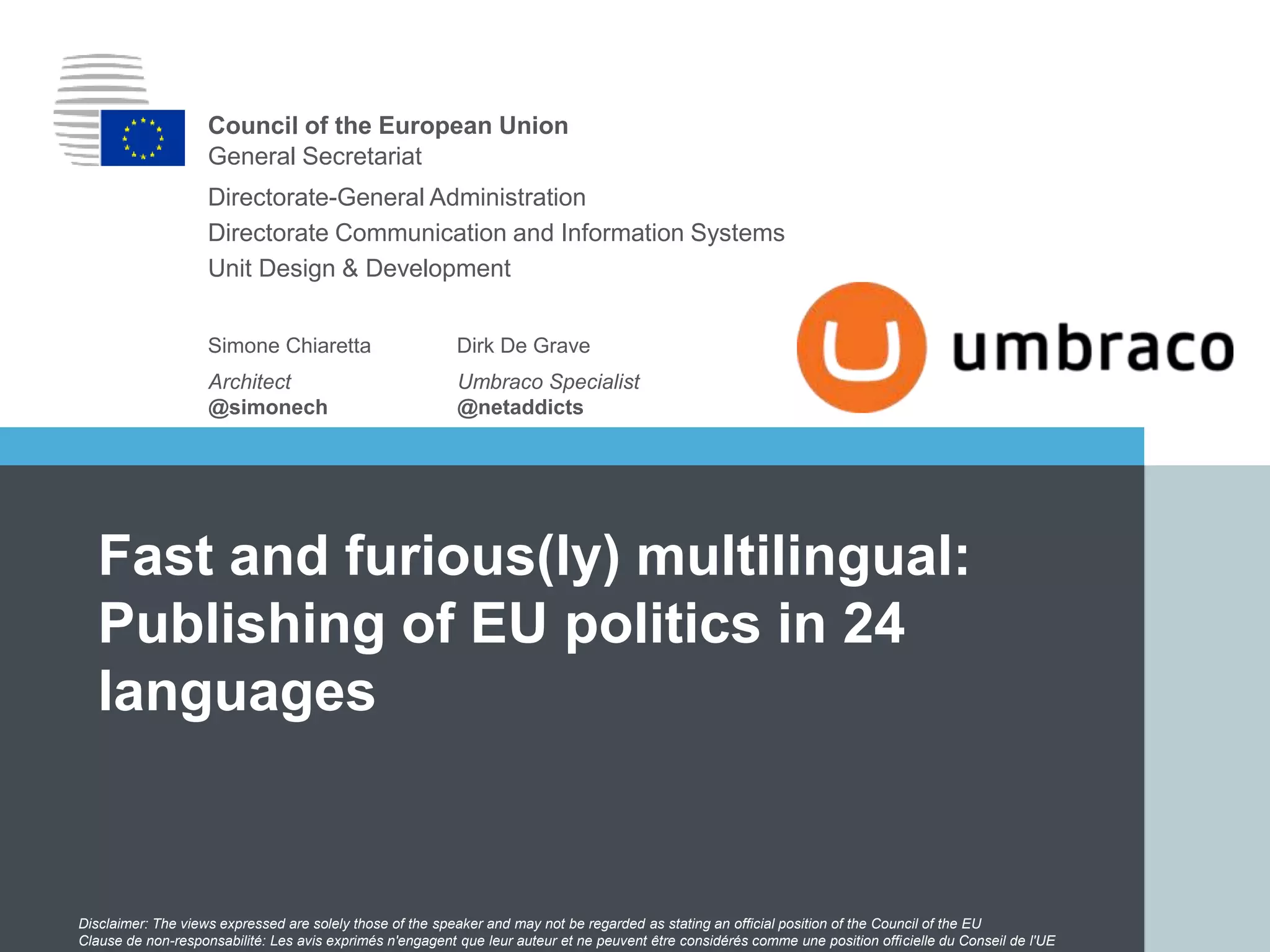 The document discusses the transition of the European Council's website to Umbraco as a content management system to support multilingual publishing in 24 official EU languages. It details the technical architecture, workflows, and system integrations, highlighting challenges in translation and data synchronization while aiming for user-friendly editing experiences. The goal is to enhance content accessibility and management for editors while ensuring efficient performance and scalability.