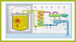 A fast breeder reactor uses both fission and nuclear reactions to generate energy. Uranium-238 absorbs neutrons and transforms into fissile plutonium-239, which is then used as fuel along with uranium dioxide. The core contains inner and outer parts - the inner uses mixed uranium/plutonium dioxide for fission, while the outer converts U-238 to Pu-239. Liquid sodium is used as a coolant instead of water. Heat is transferred between primary, secondary, and steam loops for safety.