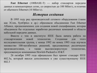 Документ описывает стандарты Fast Ethernet (100Base-T), которые обеспечивают скорость передачи данных до 100 Мбит/с, предлагая преемственность с традиционным Ethernet. В нем обсуждаются различные физические интерфейсы, такие как 100Base-TX и 100Base-FX, а также преимущества и недостатки технологии, включая характеристики сетей и использование различных типов оборудования. Заключение подчеркивает, что, несмотря на определенные недостатки, Fast Ethernet обеспечивает значительное увеличение пропускной способности по сравнению с предыдущими стандартами.