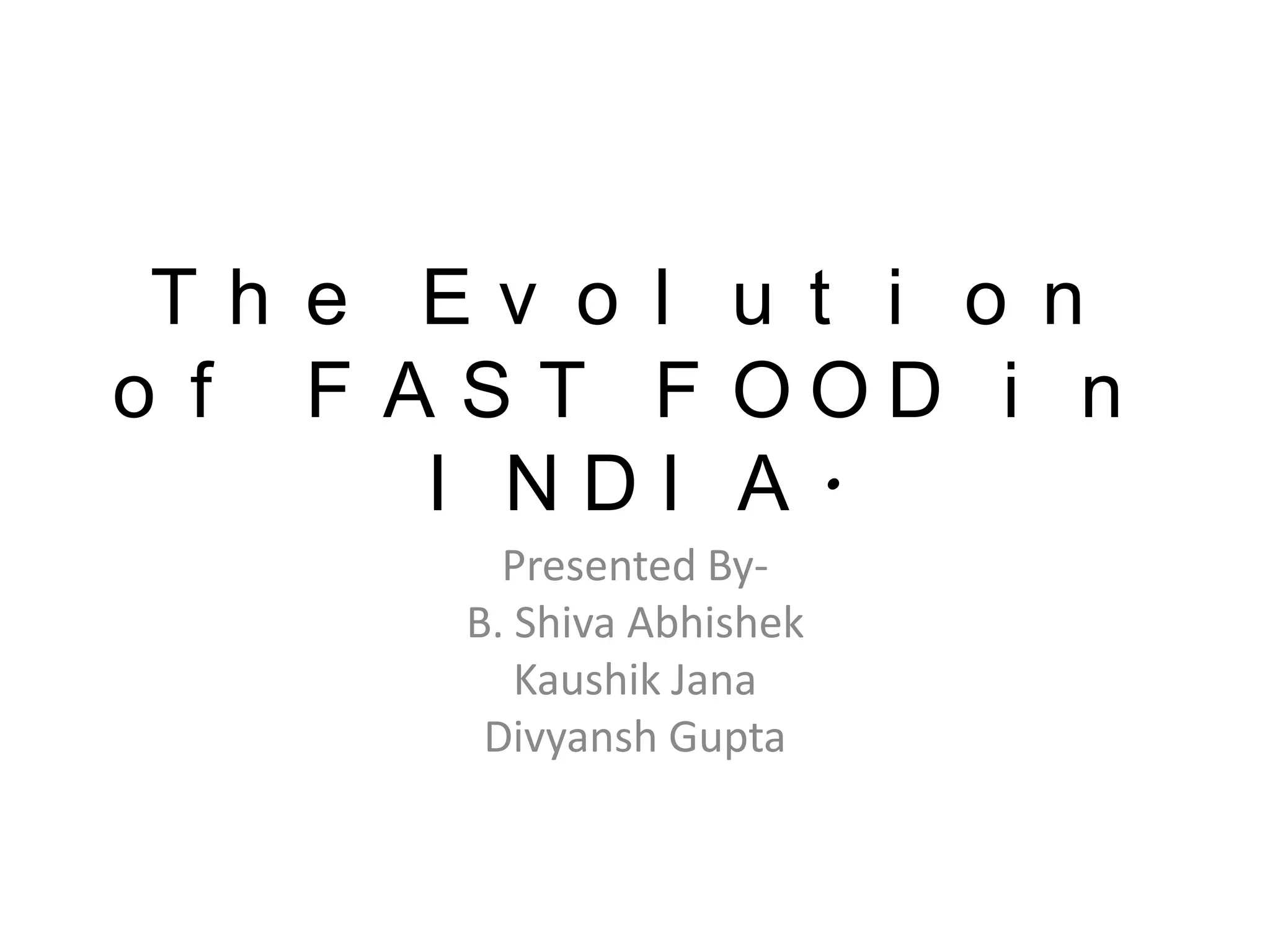 The document provides a history of the fast food industry in India. It summarizes how fast food started in the US in the 1920s and expanded globally. Major fast food chains like KFC, Domino's, and McDonald's entered India in the 1990s and saw success by localizing their menus and pricing. The fast food industry in India is now growing rapidly due to factors like increasing incomes, westernization, and busy lifestyles. While providing jobs and convenience, critics argue it also brings health and addiction issues.