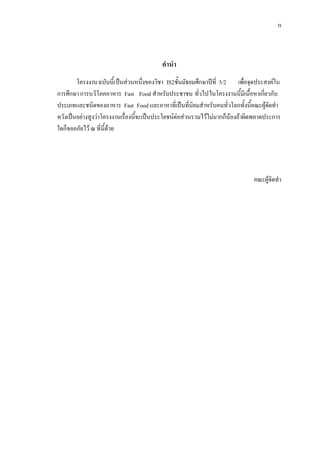ไมตองใชตนทุนเยอะในการทํางาน 1.2.2 ความมีเหตุผล คือ สามารถนําไปเปนขาวสารความรูแกคนอื่นได 1.2.3 ความมีภูมิคุมกัน คือ นํามาใชในชีวิตประจําวัน 1.2.4 เงื่อนไขความรู คือ ไดความรูในการคนหาและคนพบสิ่งใหมมากขึ้น 1.2.5 เงื่อนไขคุณธรรม คือ เรานําความจริงมาบอกใหทุกคนไดทราบโดยทั่วกัน 1.3จุดประสงคของการทําโครงงาน 1.3.1เพื่อศึกษาชนิดของอาหาร Fast Food ที่เปนที่นิยม 1.3.2เพื่อศึกษาโทษของอาหาร Fast Food 1.4 สมมติฐานของการศึกษาโครงงาน 1.4.1 การบริโภคอาหาร Fast Food เพิ่มมากขึ้นทุกป 1.5ประโยชนที่คาดวาจะไดรับ 1.5.1ไดความรูเกี่ยวกับโทษของอาหาร Fast Food 1.5.2ไดทราบวาอาหารชนิดใดเปนที่นิยม 1.5.3 ไดทราบวาอาหาร Fast Food มีอะไรบาง