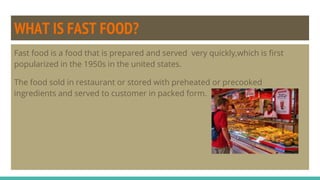 Fast food is prepared and served quickly using precooked or preheated ingredients. Common fast food items include hamburgers, sandwiches, fried chicken, pizza, and fries. While fast food is convenient and saves time, it can negatively impact health. The excess calories, fat, sugar, and sodium in fast food are linked to obesity, liver damage, heart attacks, and malnutrition due to a lack of important nutrients. To maintain good health, people should be aware of the drawbacks of fast food and choose healthier options when possible.