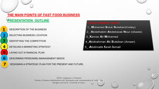 The document outlines the key points to consider when starting a fast food business, including selecting a business location based on customers and accessibility, identifying competitors and their strengths/weaknesses, describing the business and products sold, developing a marketing strategy using different advertising tools, laying out a financial plan with sales forecasts and budgets, describing management and personnel needs in terms of skills and responsibilities, and designing a strategic plan with a vision and mission for the present and future of the business.