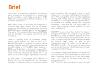 Fast Fuel is launching a new energy drink in the Canadian market. It aims to target hard working professionals aged 35-49 with a household income over $100,000. The marketing campaign will run for three months from January to March 2020. Fast Fuel must differentiate itself from competitors like Red Bull and Monster to gain market share. The summary focuses on developing brand awareness and loyalty through an integrated marketing communications strategy using both online and offline promotional activities.