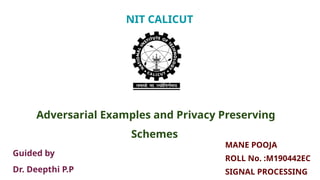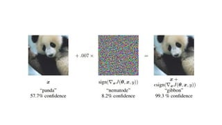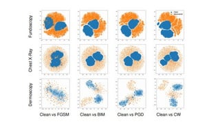 The document discusses various aspects of adversarial examples in machine learning, focusing on their creation, impact on neural networks, and methods for defense, including adversarial training and Gaussian mixture models for detection. It highlights the increased susceptibility of deep learning models, especially in medical image analysis, to adversarial attacks due to complex textures and overparameterization, while also introducing techniques to maintain privacy through differential privacy approaches. The findings indicate that adversarial attacks can be easily generated and detected, raising concerns about the robustness of models used in critical applications like medical diagnostics.