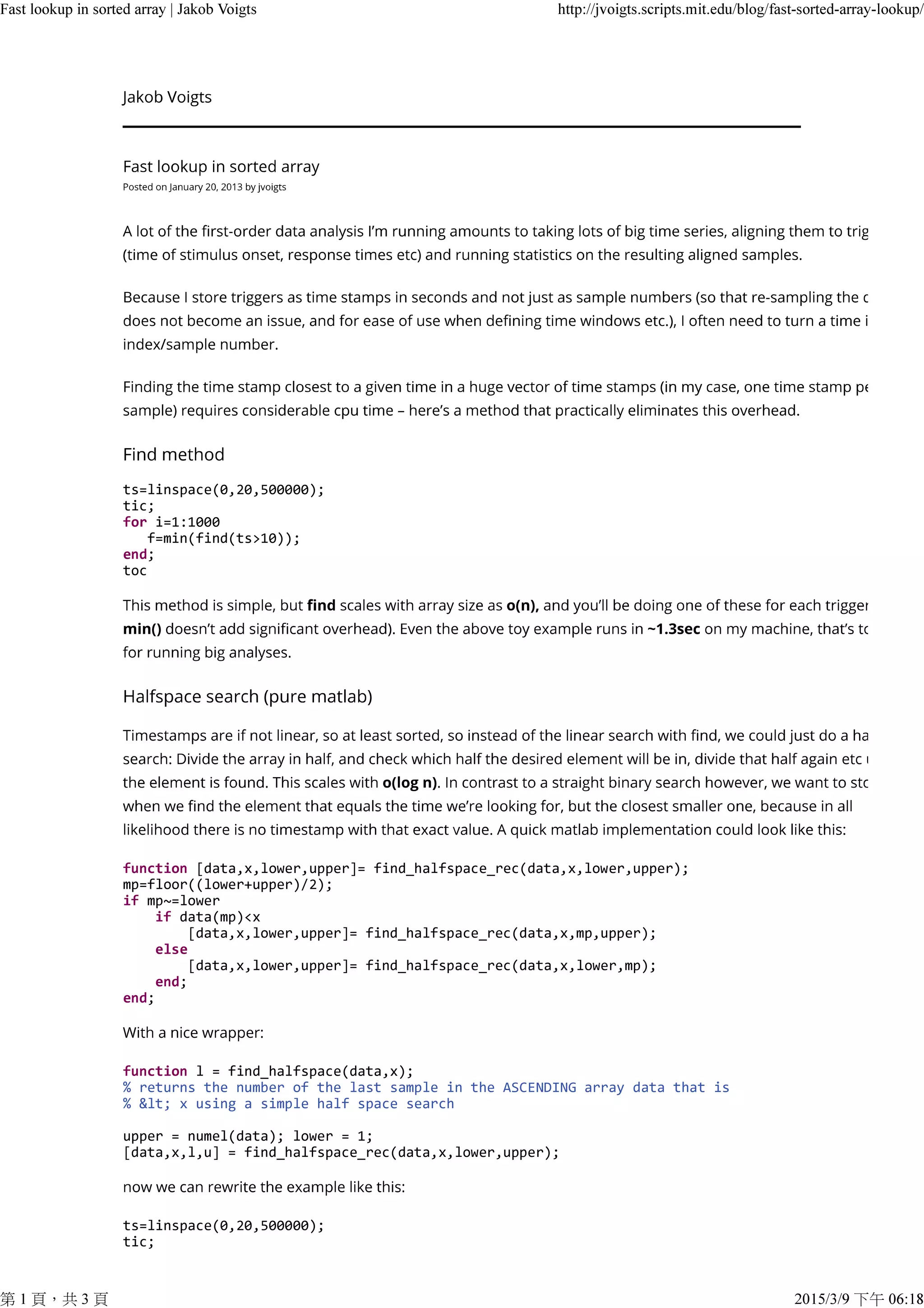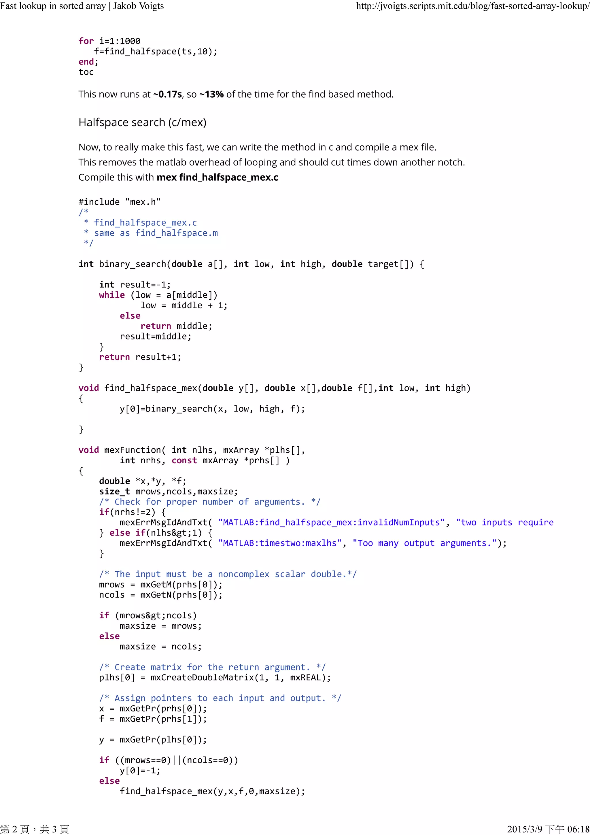 This document presents code for quickly finding the index of the last value in a sorted array that is less than a given value x. It uses a binary search approach implemented recursively in MATLAB and as a MEX function for faster performance. Benchmarking shows the MEX version is much faster than the MATLAB implementation when performing many lookups on a large array.
