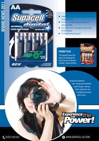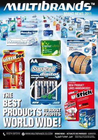 The document outlines the 2011 product lines from Multibrands, highlighting new offerings across various categories including batteries, adhesives, personal care, and baby products. It emphasizes technological advancements, attractive packaging, and advertising support for products like Supacell batteries, Ultraloc adhesives, and various lip balms. Additionally, it details point of sale (POS) units designed to maximize shelf-space while showcasing new products effectively.