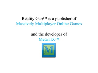 This document discusses Reality Gap, Inc., a publisher and developer of online games. It summarizes key details about some popular massively multiplayer online games (MMOGs) like World of Warcraft and Club Penguin, noting large player bases and revenues. It introduces Reality Gap's MetaTIXTM platform for microtransactions, which aims to solve problems with small transactions. It provides financial projections for two upcoming MMOG titles using this platform. Finally, it outlines details of Reality Gap's $3.5 million Series A preferred stock offering.