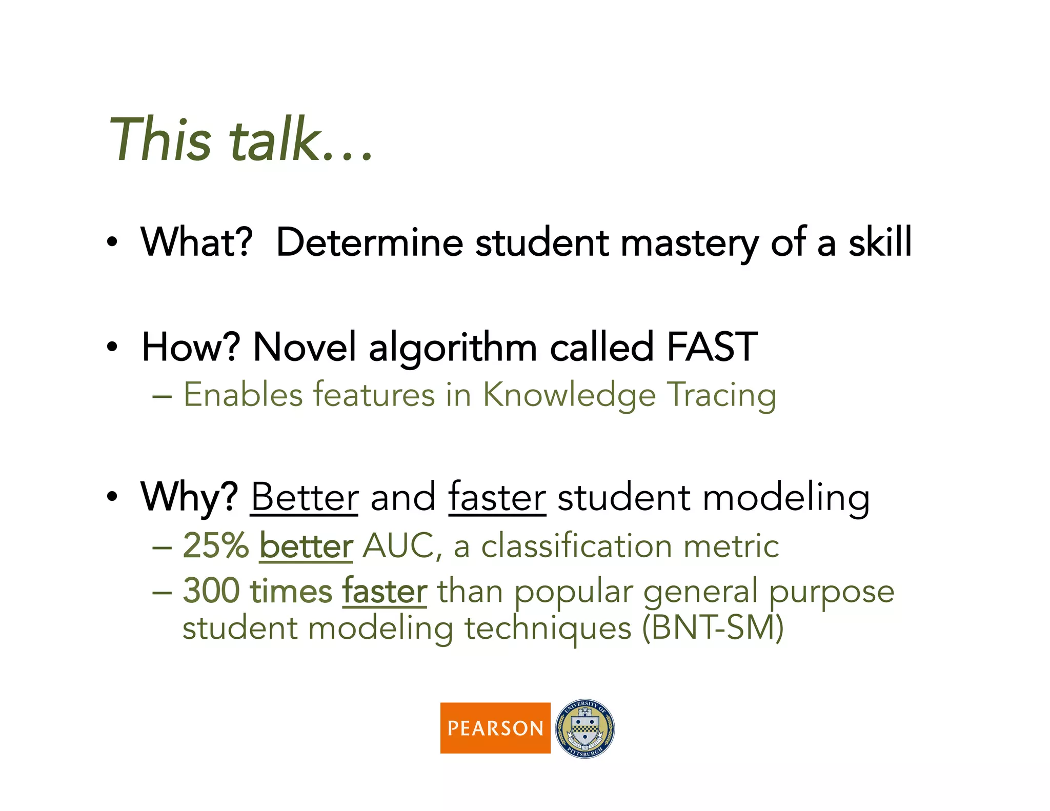 The document discusses a novel algorithm called 'fast' for feature-aware student knowledge tracing, which enhances student mastery assessment by utilizing fine-grained performance data and enabling faster processing times. The algorithm outperforms traditional methods in both accuracy and computational efficiency, achieving 25% better AUC and up to 300 times faster execution. It addresses limitations of past knowledge tracing models by accommodating multiple subskills and utilizing logistic regression for better scalability.