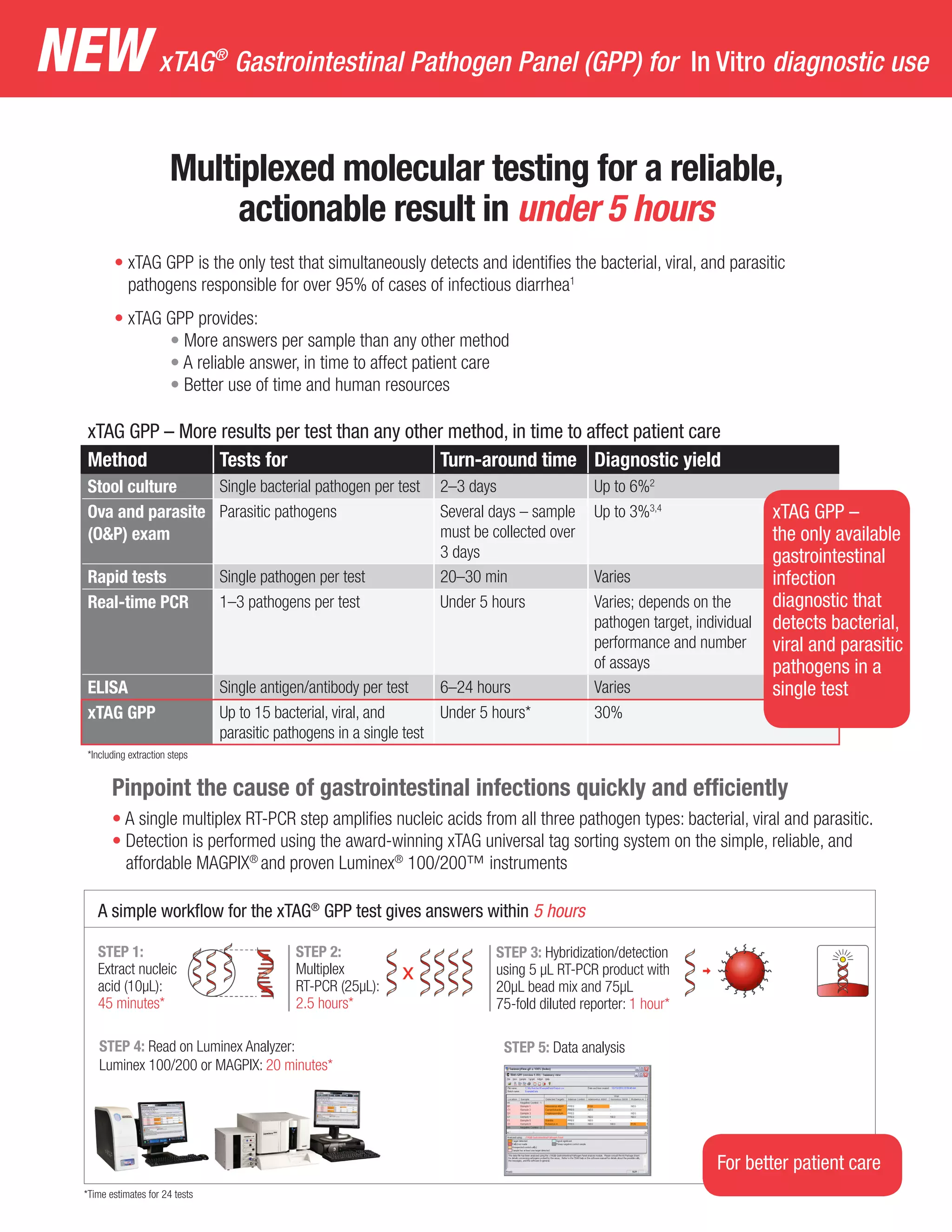 The xTAG GPP is a multiplex PCR panel that can detect 15 common bacterial, viral, and parasitic pathogens that cause infectious diarrhea from a single stool sample in under 5 hours. It is more comprehensive than culture-based tests or assays that only test for one pathogen at a time. The xTAG GPP enables timely treatment decisions with a reliable result using a simple 5-step workflow. It has demonstrated high sensitivity and specificity across all pathogen targets in its validation studies.