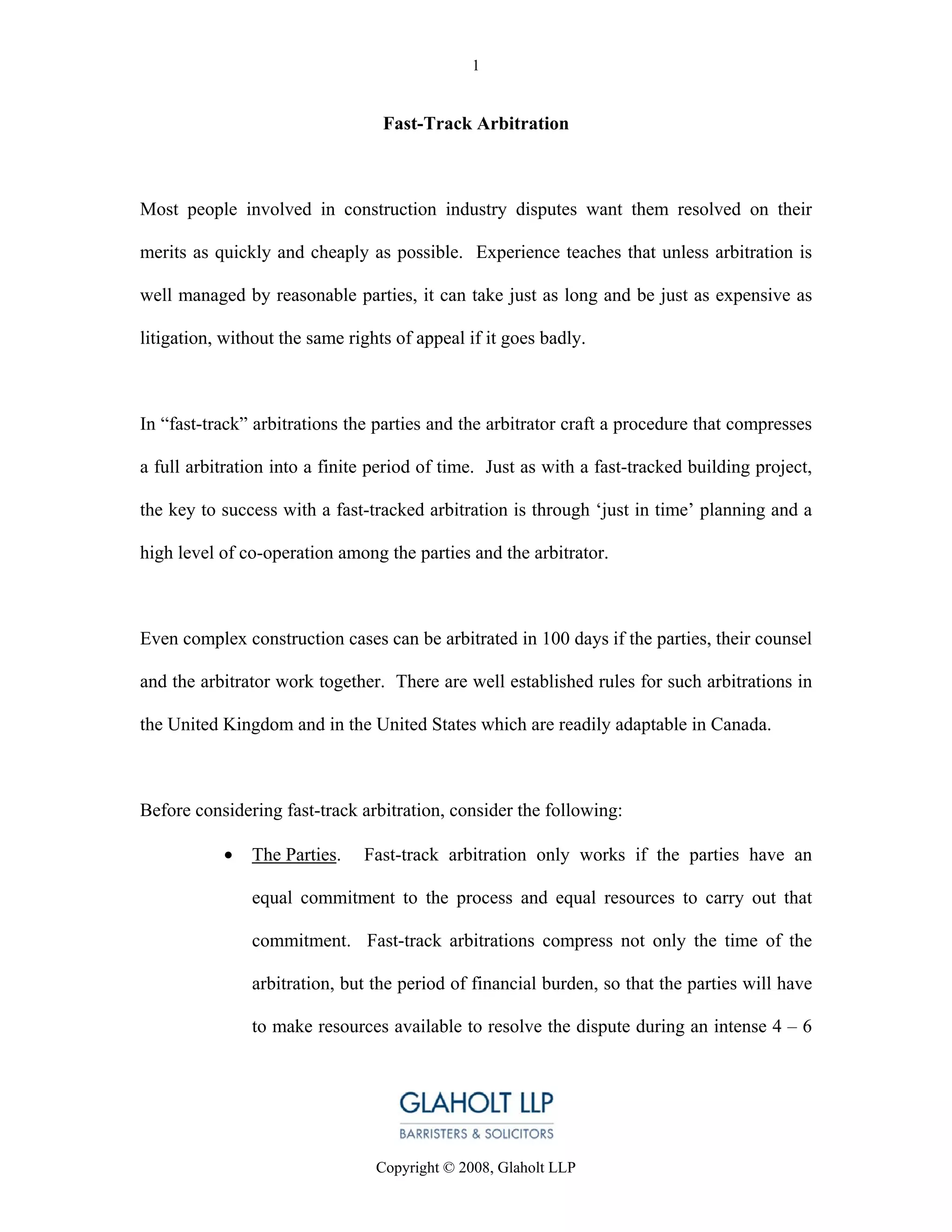 Fast-track arbitration is a procedure that compresses a full arbitration into a finite time period, similar to fast-tracking a construction project. It requires cooperation between the parties, counsel, and arbitrator. Complex construction cases can be arbitrated in 100 days with established rules in the UK and US. For fast-track arbitration to work, the parties must be equally committed and able to dedicate resources over a compressed 4-6 month period. Experienced lawyers must make strategic decisions quickly and the arbitrator must balance efficiency with fairness.