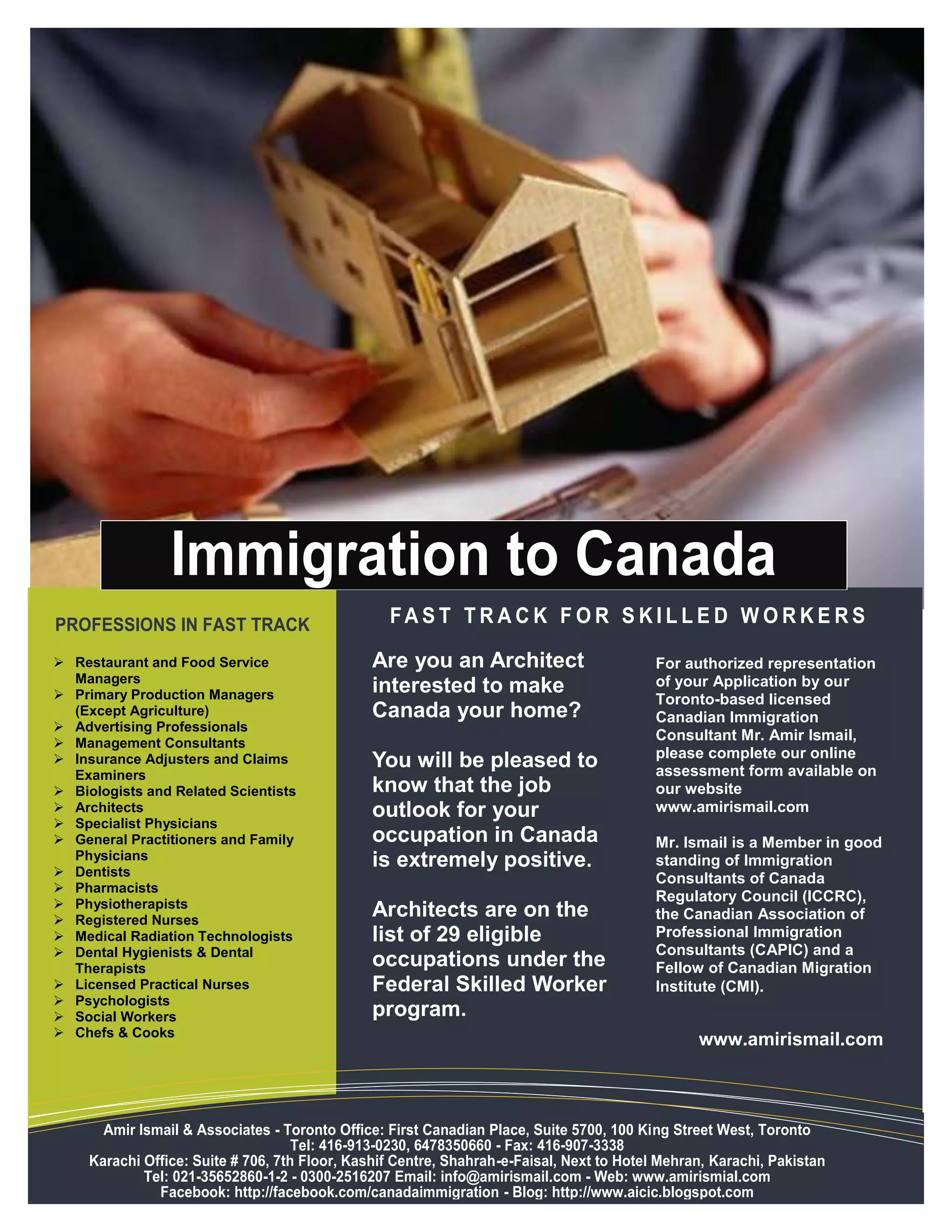 The document outlines various skilled occupations eligible for Canadian immigration through the federal skilled worker program, including professions in food service, healthcare, and management. It highlights the positive job outlook for these roles and provides contact information for immigration consultant Amir Ismail. Interested individuals can complete an online assessment form to initiate the immigration process.