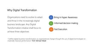 This document discusses how organizations can use process mining to fast track their digital transformations. It defines digital business transformation as using digital technologies to improve organizational performance. Process mining aims to understand business processes by discovering them automatically based on event logs from business systems. This helps identify bottlenecks, deviations, and inefficiencies to prioritize transformation initiatives and focus on areas needing immediate attention. The document promotes using process mining as part of a continuous process optimization framework to map processes, perform analytics, get recommendations, and implement approved changes.
