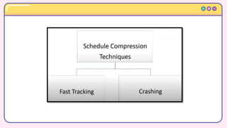 Fast tracking involves performing project activities or phases in parallel rather than sequentially to compress the schedule, but it risks missing details and team member burnout without thorough analysis. Crashing uses additional resources like overtime, hiring, or outsourcing to shorten schedule duration at the least incremental cost at a critical path. The key difference is that fast tracking overlaps tasks while crashing adds resources. Both aim to accelerate project completion when the deadline is near or the start was delayed.