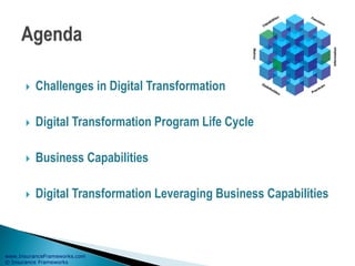 The document outlines the digital transformation processes for insurance and wealth management, emphasizing the importance of business capabilities in adapting to modern technological changes. It details the steps for successfully implementing digital transformation, including scoping, designing a vision, defining a roadmap, and sustaining cultural changes. The framework also highlights the need for organizations to engage with clients effectively and adapt to evolving market demands.