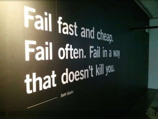 The document discusses overcoming hesitation and procrastination by failing fast and learning from mistakes. It argues life is too short to waste time hesitating, and most people hesitate due to a fear of failure. However, the key is to take action now, accept that failure may occur but can be used to learn and adjust. When starting a new project, one should limit scope, control costs to fail cheaply, and control risks. Once a fast failure occurs, evaluate lessons learned, adjust the approach, and try again.