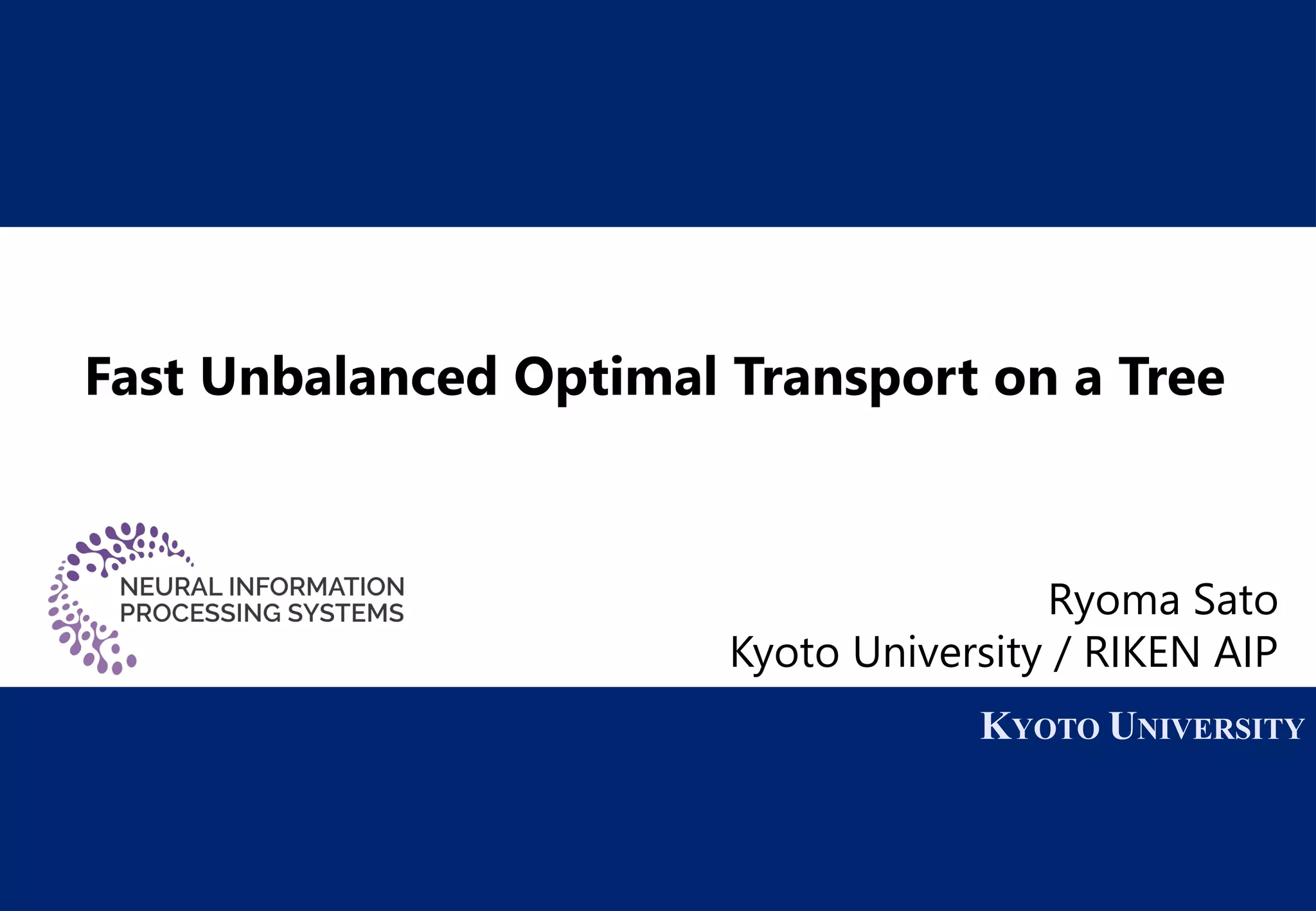 This document presents research by Ryoma Sato of Kyoto University on fast unbalanced optimal transport (UOT) algorithms that efficiently handle the transport of distribution masses while being robust to outliers. It discusses the challenges of UOT in one-dimensional spaces and introduces a new algorithm that reduces the computational complexity to O(n log² n), which is significantly faster than traditional methods. The proposed method extends to tree spaces and demonstrates empirical effectiveness, computing UOT with one million masses in under one second.
