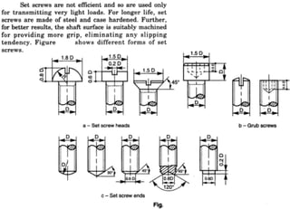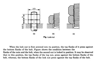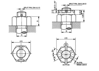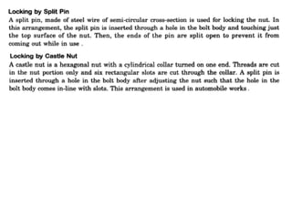 This document discusses different types of fasteners and fastening methods. It describes threaded fasteners like bolts, screws, and nuts. It defines screw thread terminology and profiles of common thread types. It explains characteristics of bolts and nuts like chamfering, washer facing, and counter-sinking. Methods for drawing hexagonal and square head bolts and nuts are also presented. The document provides details on different threaded fastener components and their uses to fasten and join parts in machines and structures.