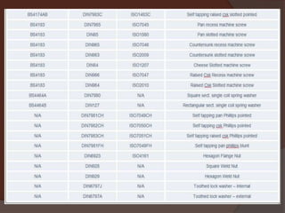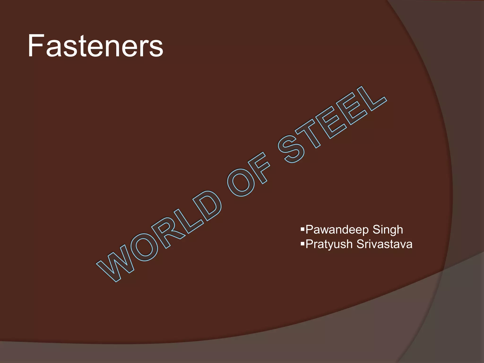 Fasteners are hardware devices that mechanically join or affix objects together. There are many types of fasteners including threaded and non-threaded. Threaded fasteners have external or internal threads and are defined by properties like pitch, diameter, and thread angle. Fasteners can be removable, semi-permanent, or permanent. Manufacturing processes for threaded fasteners include forging, rolling, and turning. Standards organizations define specifications for fastener design. Special fasteners may require unique designs or coating for corrosion resistance. The fastener industry is important for automotive, industrial, and construction applications.