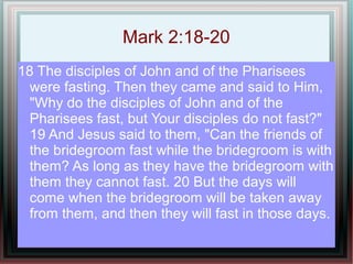 The passage discusses why Jesus' disciples did not fast like John the Baptist's and the Pharisees' disciples. Jesus explains that his disciples do not need to fast while he is with them, but will fast after he is taken away. It also provides valid reasons for fasting such as humility, prayer, and spiritual renewal, and wrong reasons like anger or pride. Fasting should be done privately and for drawing near to God, not to impress others.
