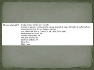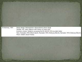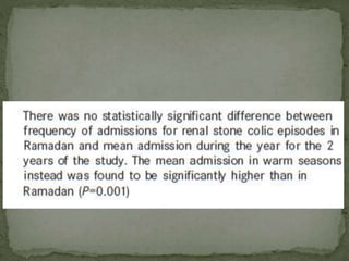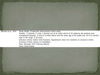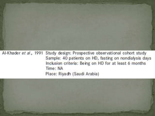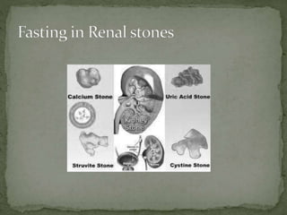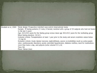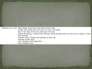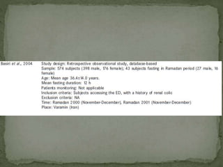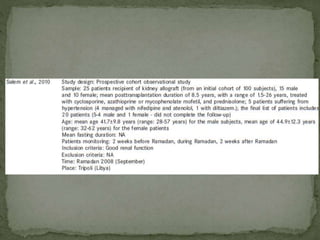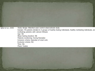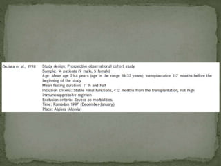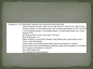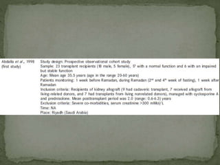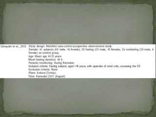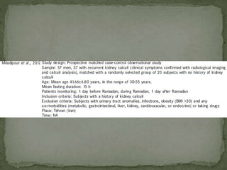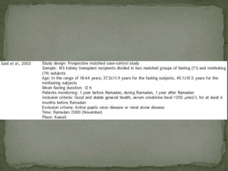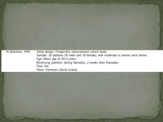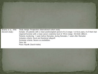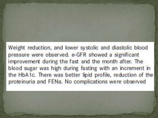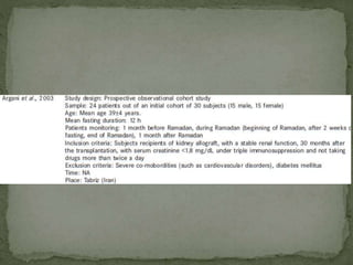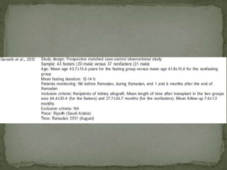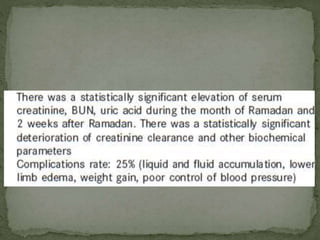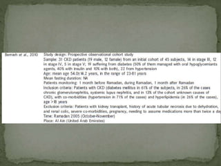 Ramadan fasting and chronic kidney disease: A systematic review summarizes 25 original studies (now totaling 31 studies) investigating the relationship between Ramadan fasting and chronic kidney disease. The studies analyzed a total of 1,262 subjects with CKD who fasted during Ramadan (now totaling 1,638 including subjects from 3 new studies). Most studies found that fasting did not significantly impact renal function or biochemical parameters, with any changes fully reversible after Ramadan. However, two new studies found worsening renal function or cardiovascular events in patients with advanced CKD or risk factors who fasted. Fasting may be allowed for most CKD patients with precautions like medication adjustments and monitoring, but is not recommended for
