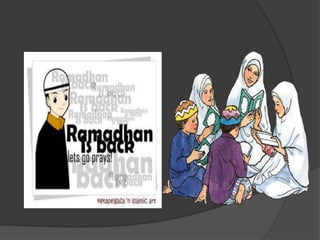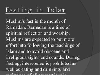 Muslims fast during the month of Ramadan from dawn to sunset. Fasting involves abstaining from food, drink, and intercourse, and encourages resisting temptations. It aims to redirect the heart from worldly activities and cleanse the soul. Muslims who have reached puberty and are physically and mentally fit are expected to fast, unless exempt due to health issues, old age, pregnancy, menstruation, or travel. The month involves increased worship, prayer, charity, and Quran recitation, as well as sharing meals and gifts with family and friends.
