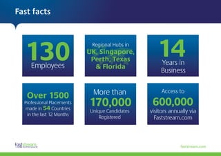 Faststream is a mining recruitment firm with 130 employees across regional hubs in the UK, Singapore, Perth, Texas, and Florida. They have placed over 1500 professionals in 54 countries in the last 12 months and have access to over 600,000 visitors annually on their website. They recruit for a wide range of mining roles and have a global database of over 120 candidate nationalities. Their services include permanent recruitment, contract recruitment, executive search, recruitment process outsourcing, and international payroll services. They have strong performance metrics such as referral to placement ratios well below industry averages and low staff turnover.
